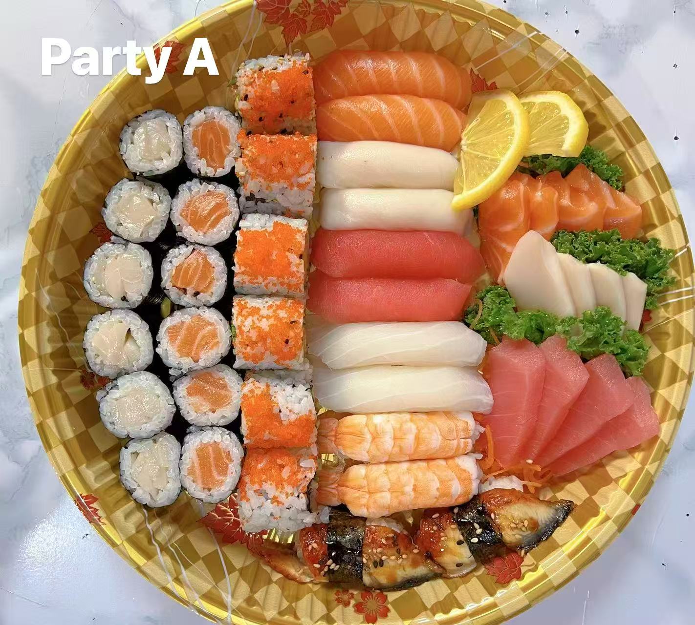 Sashimi (12pcs)Salmon, Snapper, White Tuna.Sushi (12pcs) Salomon, White Tuna, Shrimp, Snapper, BBQ Eel, Crab meat.Maki Roll (18pcs)California Roll, Salmon Roll, White Tuna Roll.