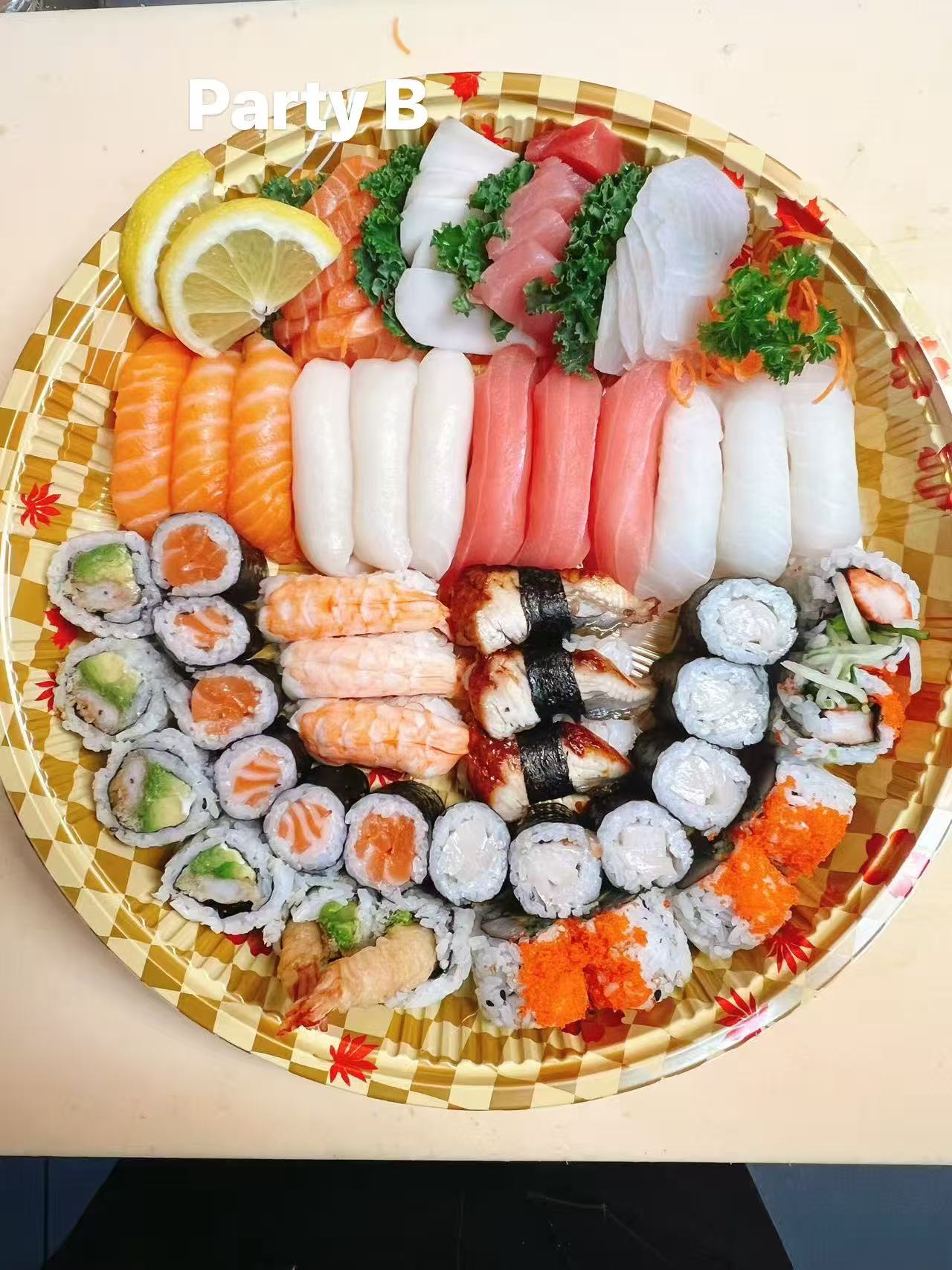 Sashimi (20pcs)Salmon, White Tuna, Snapper, Red Tuna.Sushi (18pcs) Salomon, White Tuna, Shrimp, Snapper,B.B.Q Eel, Crab Meat.Maki Roll(24pcs)California Roll, Avocado Shrimp Tempura Roll, Salmon Roll,White Tuna Roll.